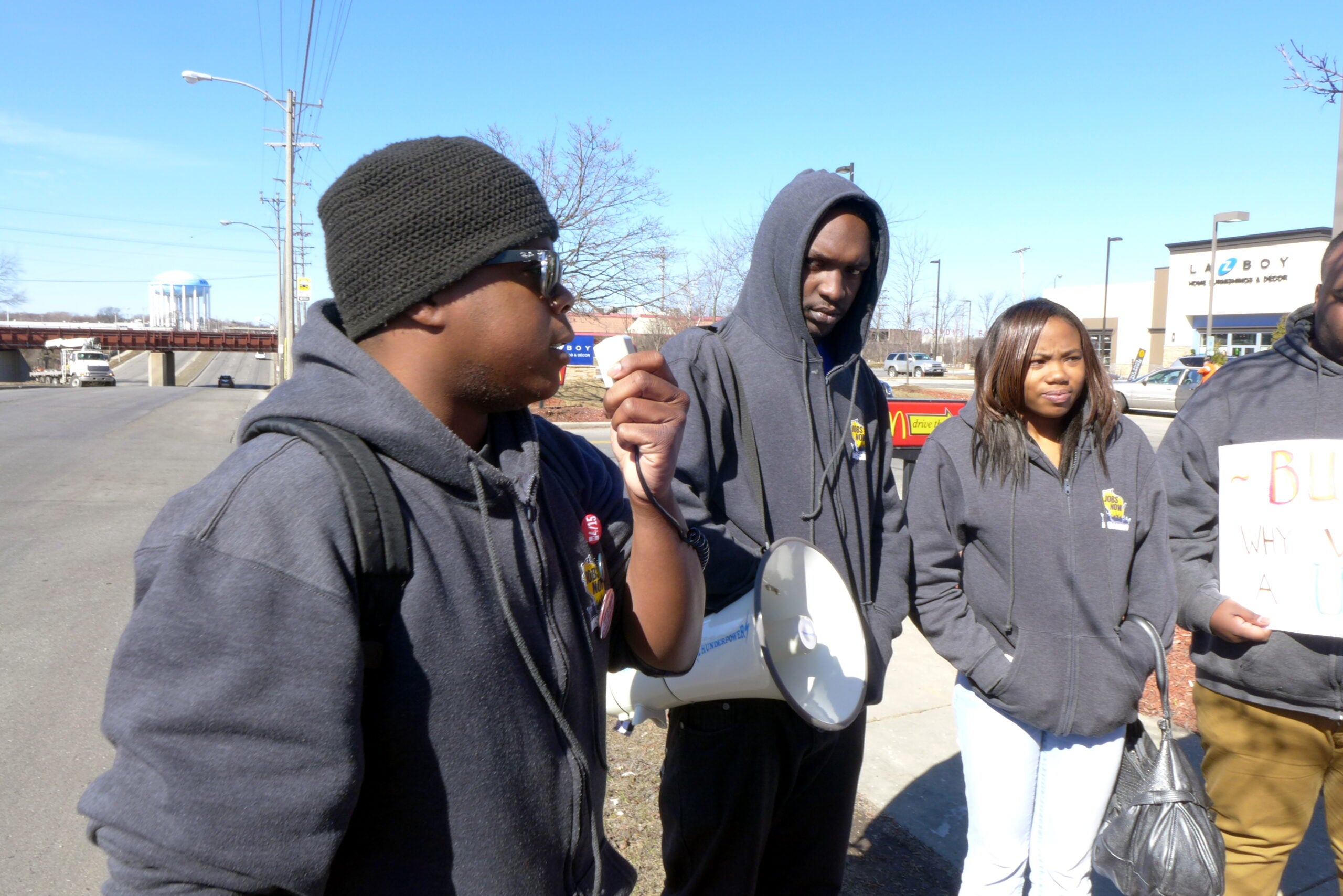Protesters gathered outside a suburban Milwaukee McDonald’s restaurant on Tuesday as part of a national labor campaign publicizing grease burns suffered by McDonald’s workers.
