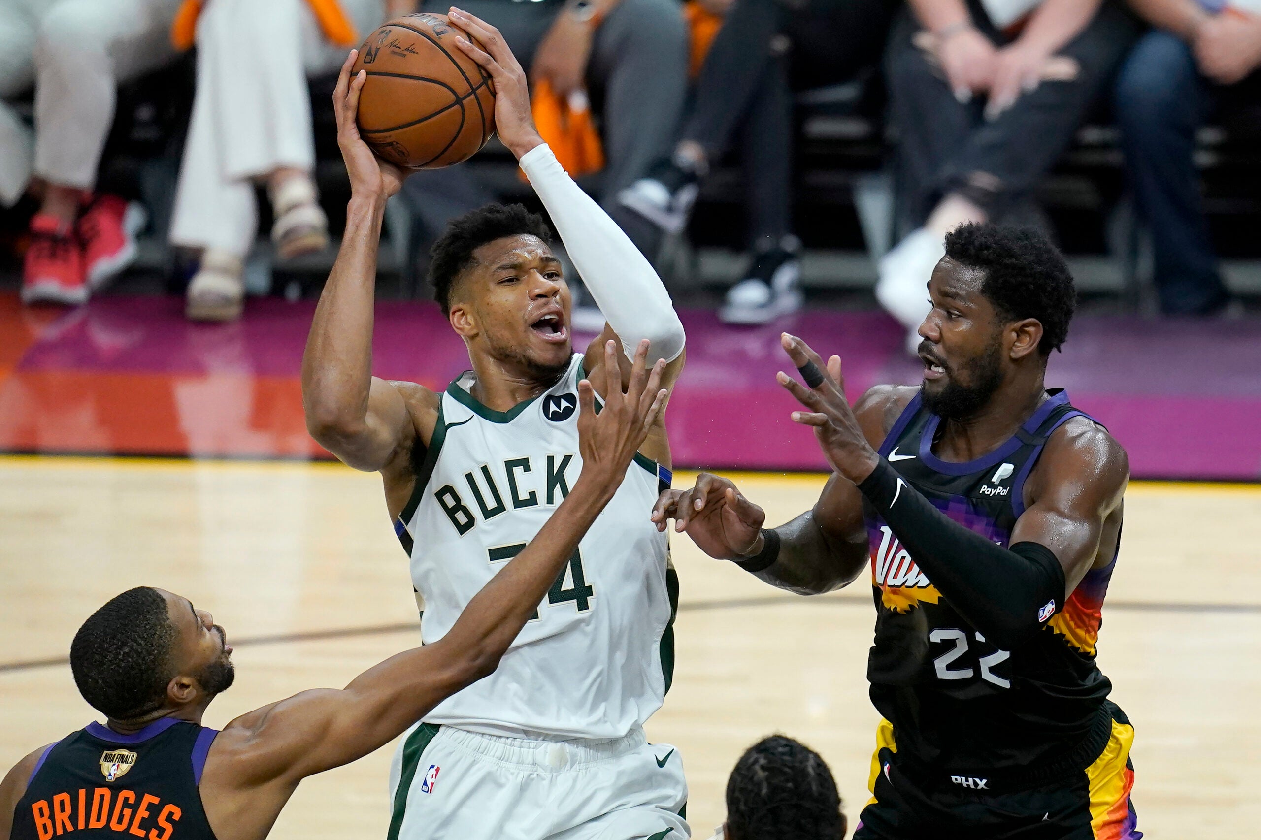 Giannis Antetokounmpo opened Game 2 with a dunk. His dominance in the paint was a theme that would carry throughout Thursday’s game. But it wasn’t enough to overcome the sharpshooting Suns.