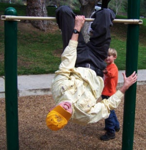 So Zorba challenged Tom to put his money where his mouth was and hang from the monkey bars, with photographic proof of course. Tom promised he would do so when the weather cleared. Well, on a recent trip to the West Coast to visit his grandchildren, Tom made good on his promise.