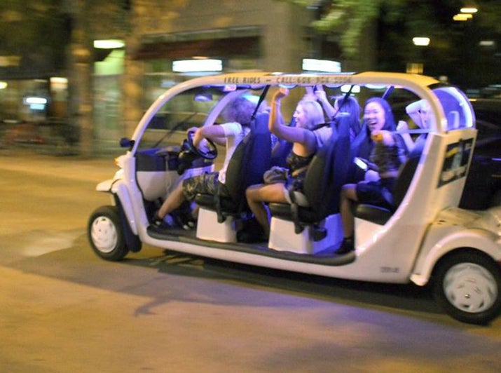 According to Morning, cab services are not something students want to spend money on. That’s why he doesn’t charge for rides in the Madtown Hopper, an electric car he operates as a taxi in downtown Madison.