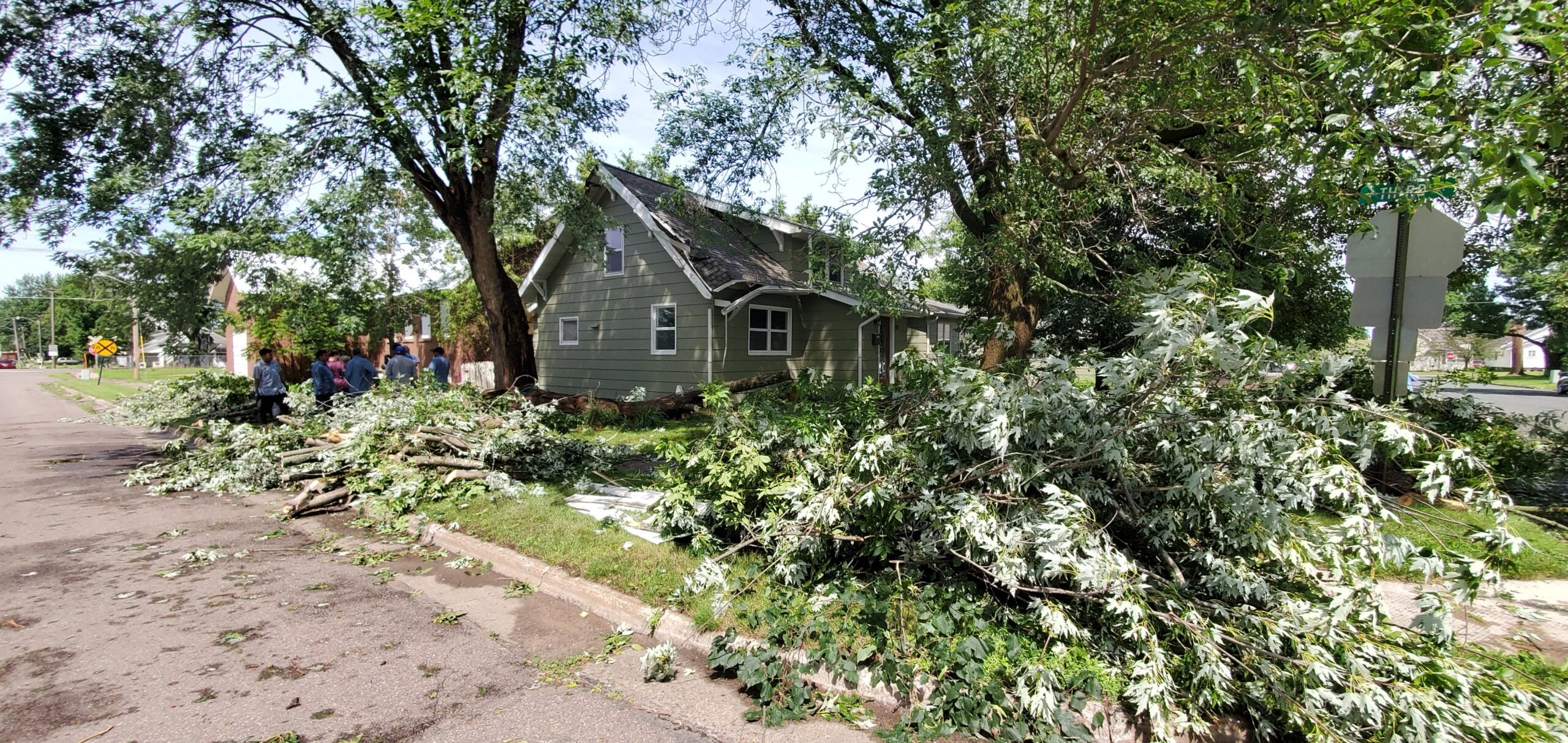 Tyler Gruetzmacher and his family were clearing trees and branches from his yard Saturday. He said he was on his way home when the storm hit Friday evening he said the wind and debris blowing across the road were bad enough that he sought shelter at a nearby farm. When he got home, he found tree trunks had knocked over his chimney and broke through the eaves of his roof.