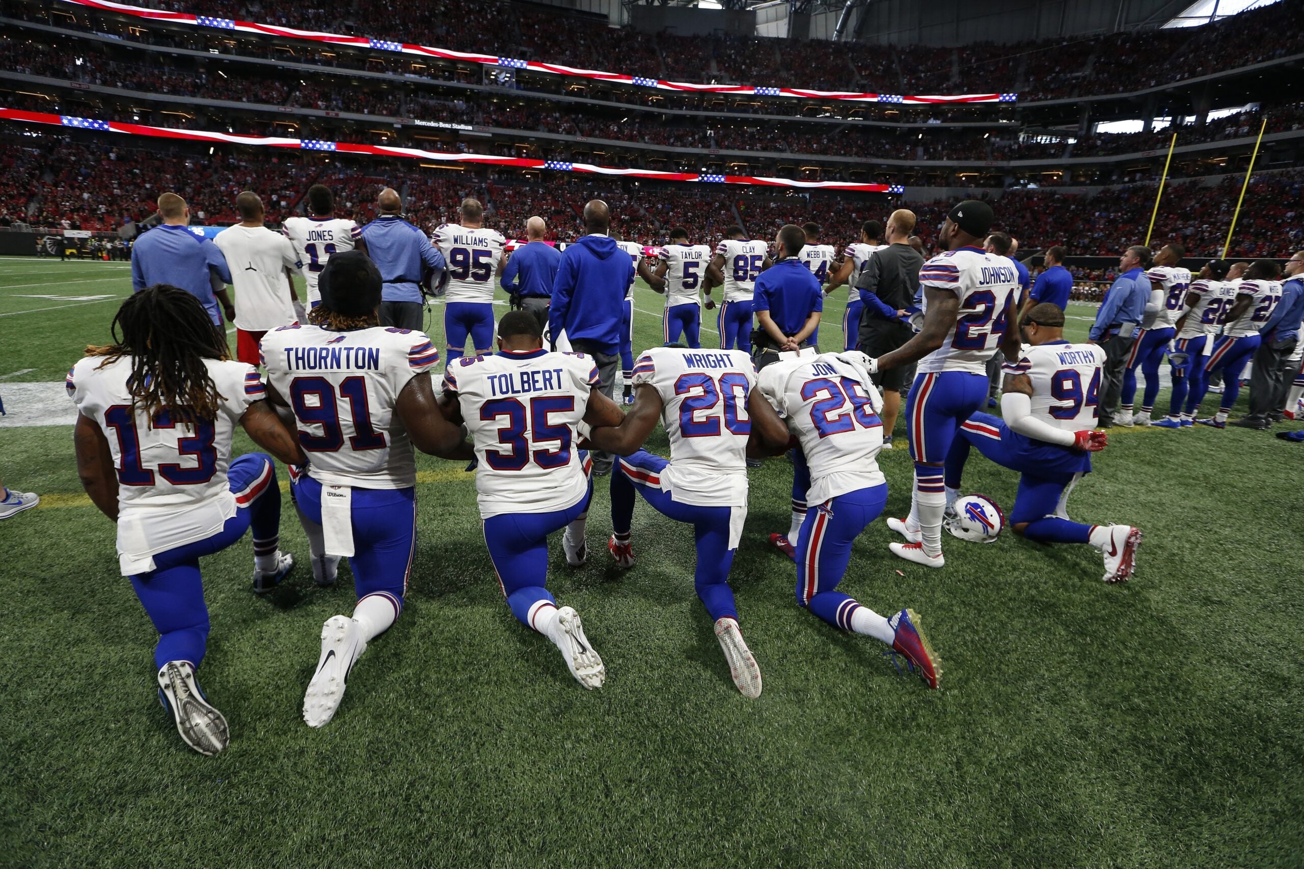 Some Buffalo Bills players take a knee during the national anthem before the first half of an NFL football game between the Atlanta Falcons and the Buffalo Bills, Sunday, Oct. 1, 2017, in Atlanta. (AP Photo/John Bazemore)